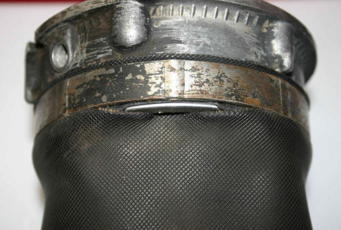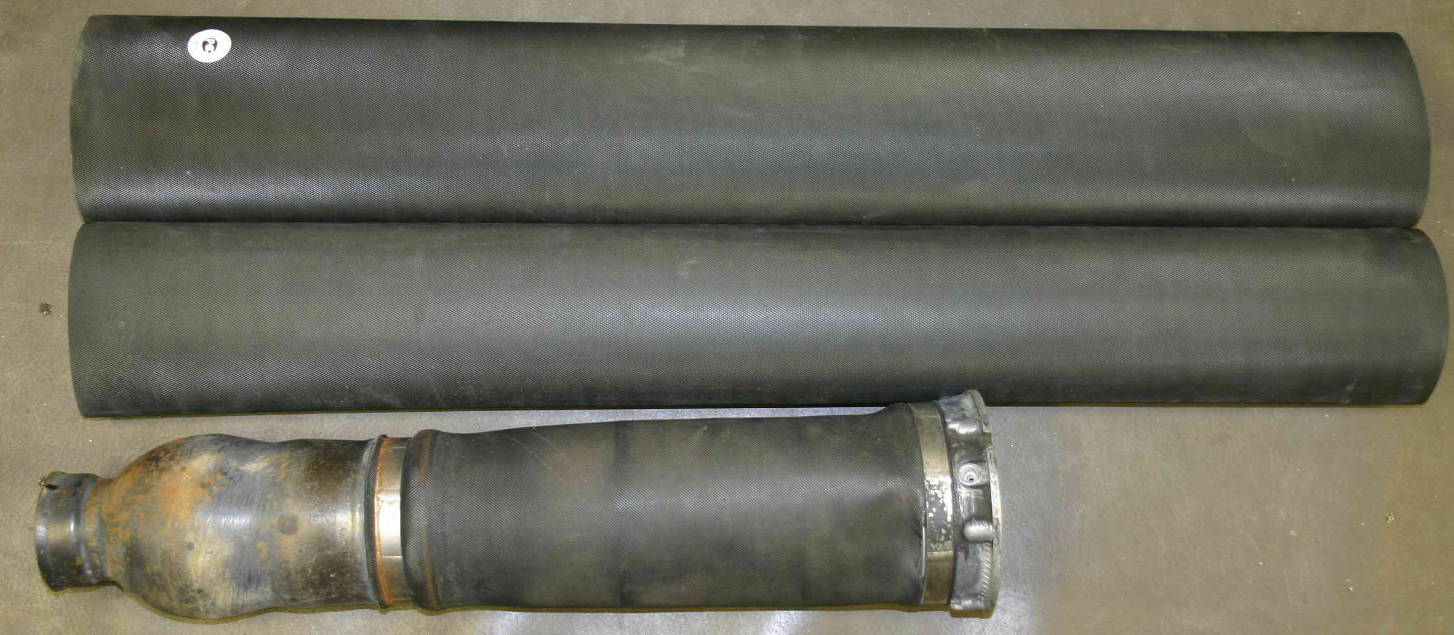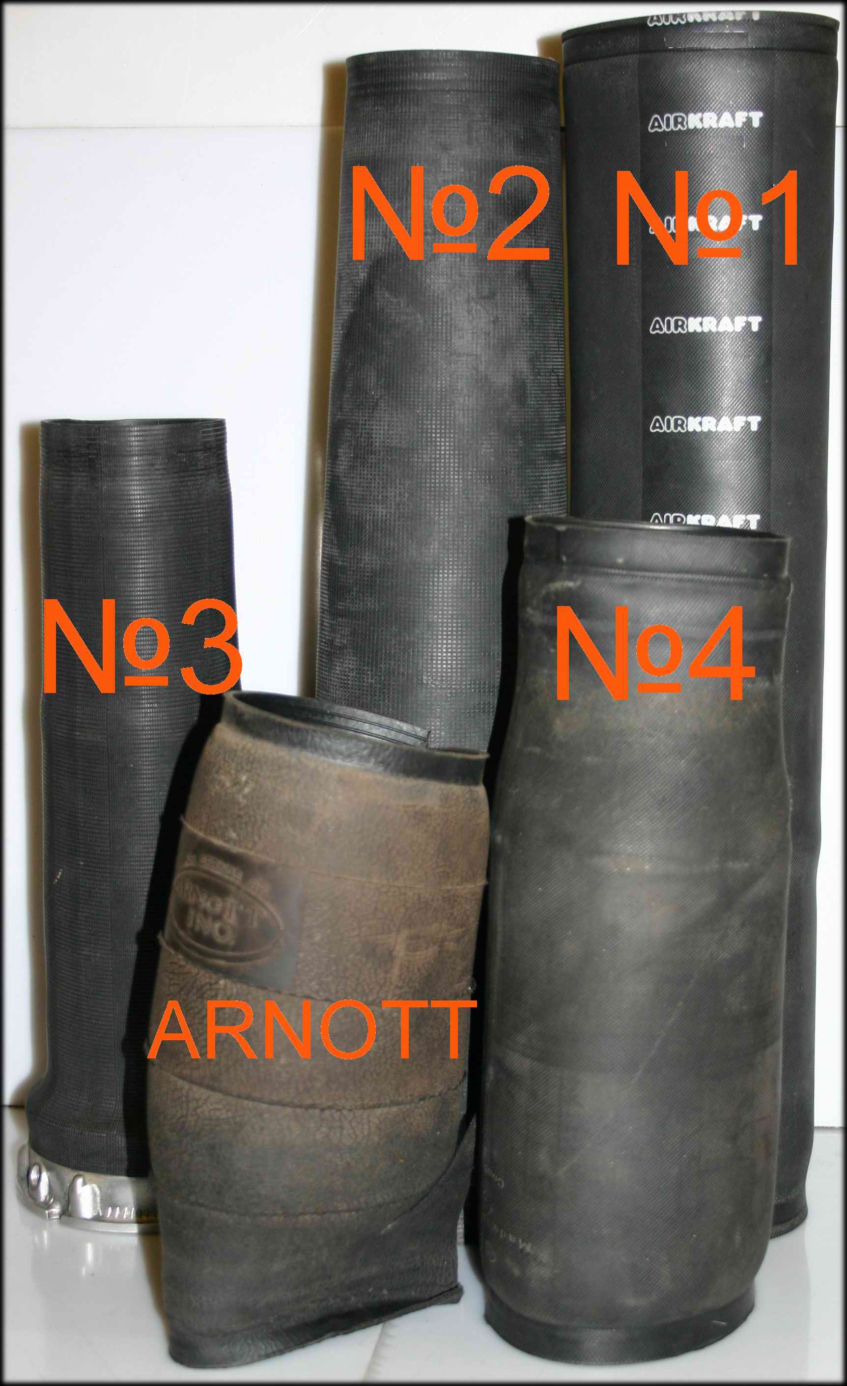 На фото слева наглядно видно, что рукав марки Арнотт самый короткий, самая большая длина у рукава AIRKRAFT. Но всё равно при установке рукава подрезаются под размер рукава №3. Чем меньше длинна рукава, тем меньше объём воздуха в баллоне. От количества воздуха зависит жесткость подвески и пиковые нагрузки на манжету. Если рукав меньшей длины то машина поднимается быстрее, так как воздуха требуется меньше. Также давление в рукаве зависит от диаметра рукава в раздутом состоянии. Чем он больше, тем давление меньше. Ещё многие заблуждаются считая, что с подъёмом машины давление увеличивается. Это не так. При одинаковой площади рукава, одинаковом весе машины при подъёме меняется только объём воздуха в баллонах, а давление практически нет. Давление возрастает только когда машину загрузят и соответственно уменьшится при разгрузке машины. На фото виден Б/У оригинальный рукав под номером 4 и Б/У Арнотт. Сразу бросается в глаза разница в длине. Арнот работает в тяжелых условиях, так как давление из-за малого объёма баллона не компенсируется и корд баллона испытывает значительные нагрузки. Подвеска при малом объёме воздуха в баллоне становится более жёсткая. Обычно мы ставим рукав № 3. Это баланс между ценой и качеством. На этот рукав мы даём гарантию. |