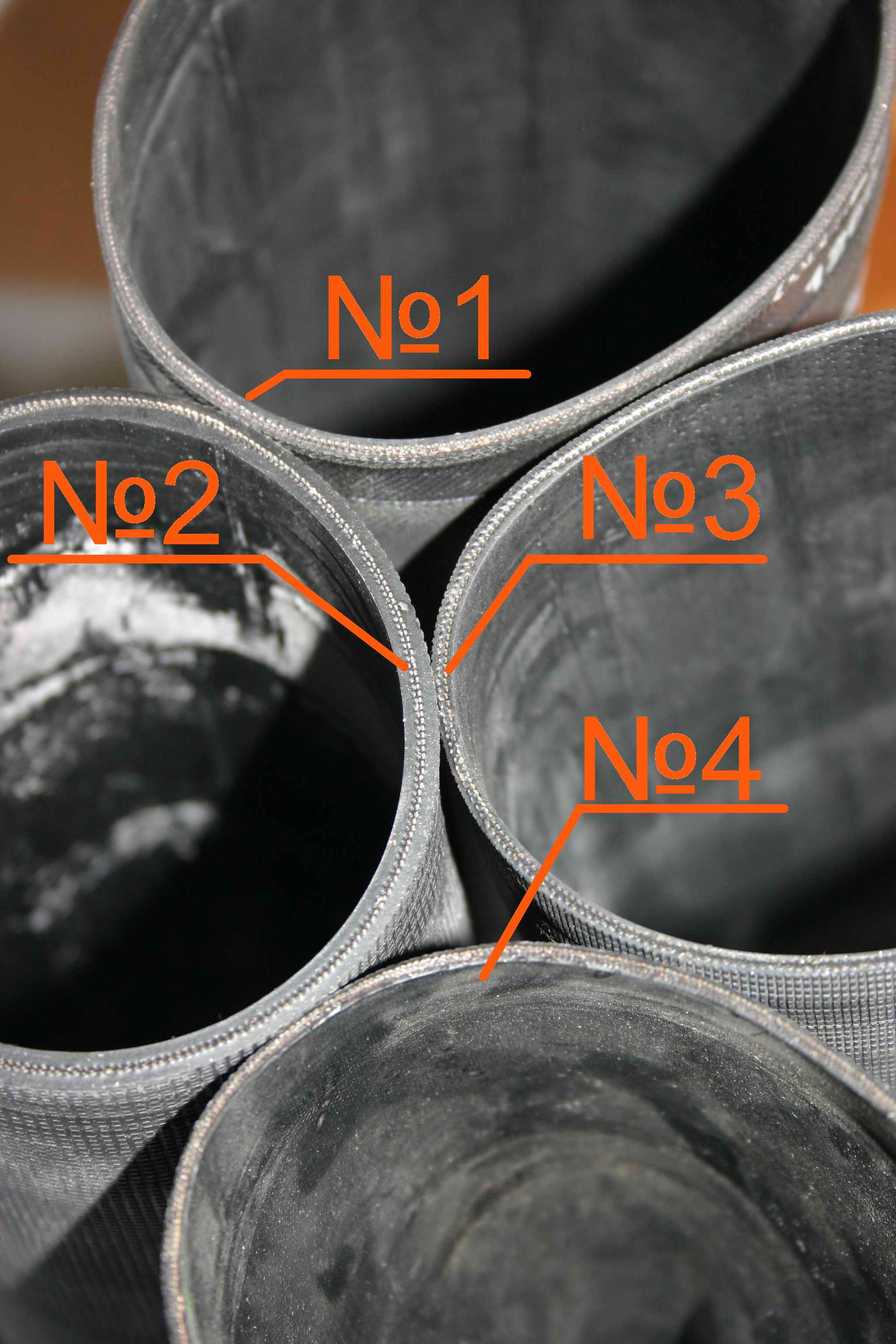 Мы устанавливаем рукава трёх типов. На фото слева под № 1 и № 3 рукава отличаются длинной, а рукав 4 толщиной и соответственно ценой. Толщина стенки 2,4 мм, что соответствует толщине стенки оригинального рукава, на фото он под номером четыре. №2 Имеет толщину стенки 4мм, что в два раза толще оригинального. Ресурс этого рукава за счёт удвоенной толщены намного больше чем оригинального рукава. Обычно после двух лет эксплуатации оригинальные рукава выходят из строя. Разрушение происходит в месте складки. Из-за реагентов которыми посыпают дороги происходит ускоренное старение наружного слоя резины и когда он разрушается, то начинает разрушаться корд. Некоторые "специалисты" пытаются ввести в заблуждения клиента предлагая загерметизировать повреждения рукава герметиком антипрокол. Этот метод на небольшой срок продлит жизнь баллона, но потом баллон из-за разрушения корда может вовсе взорваться. Более того если герметик попадёт в воздушную магистраль, то может выйти из строя блок клапанов. Реже, но всё равно встречаются случаи когда по причине не плотной обжимке кольца прессом рукав частично или полностью соскальзывает с фланца баллона. В последнее время в продаже появились рукава наших заокеанских друзей. В интернете полно рекламы перекупщиков которые хвалят этот заграничный неликвид. Качество резины этих рукавов оставляет желать лучшего. Средний пробег их составляет 20000км. Резина плохо провулканизирована. Происходит отслоение корда или закусывание рукава между фланцем баллона и направляющей. Также очень часты случаи утечки воздуха через обжимные кольца. |
